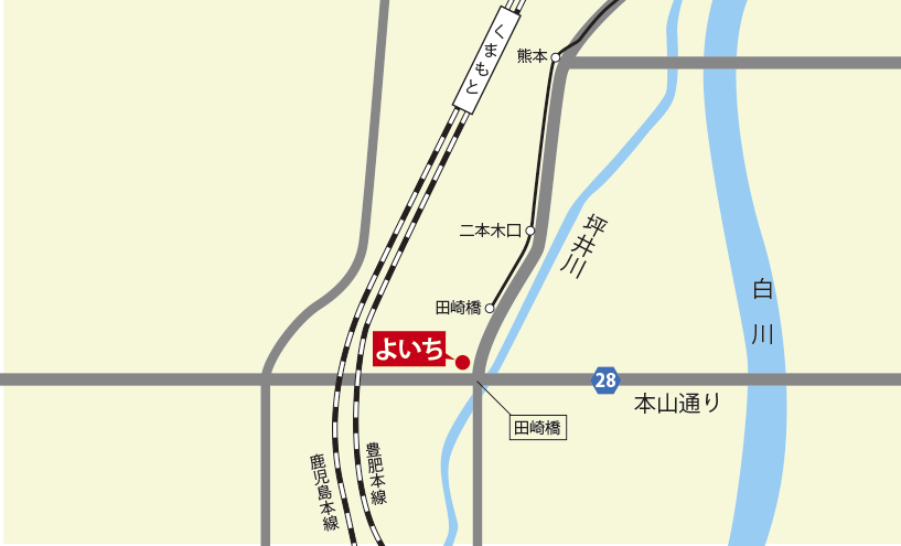 当店は田崎本町交差点にございます。田崎橋電停より徒歩1分、熊本駅より徒歩5分、駐車場完備。